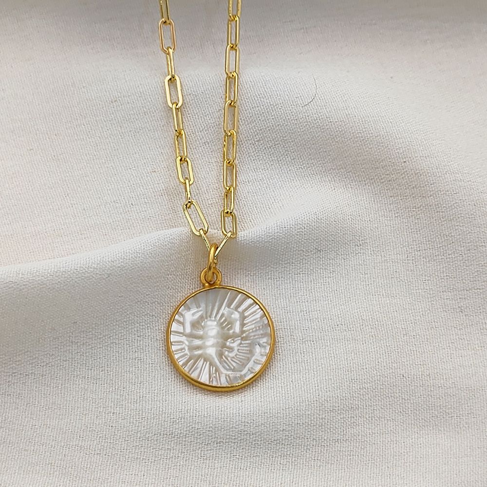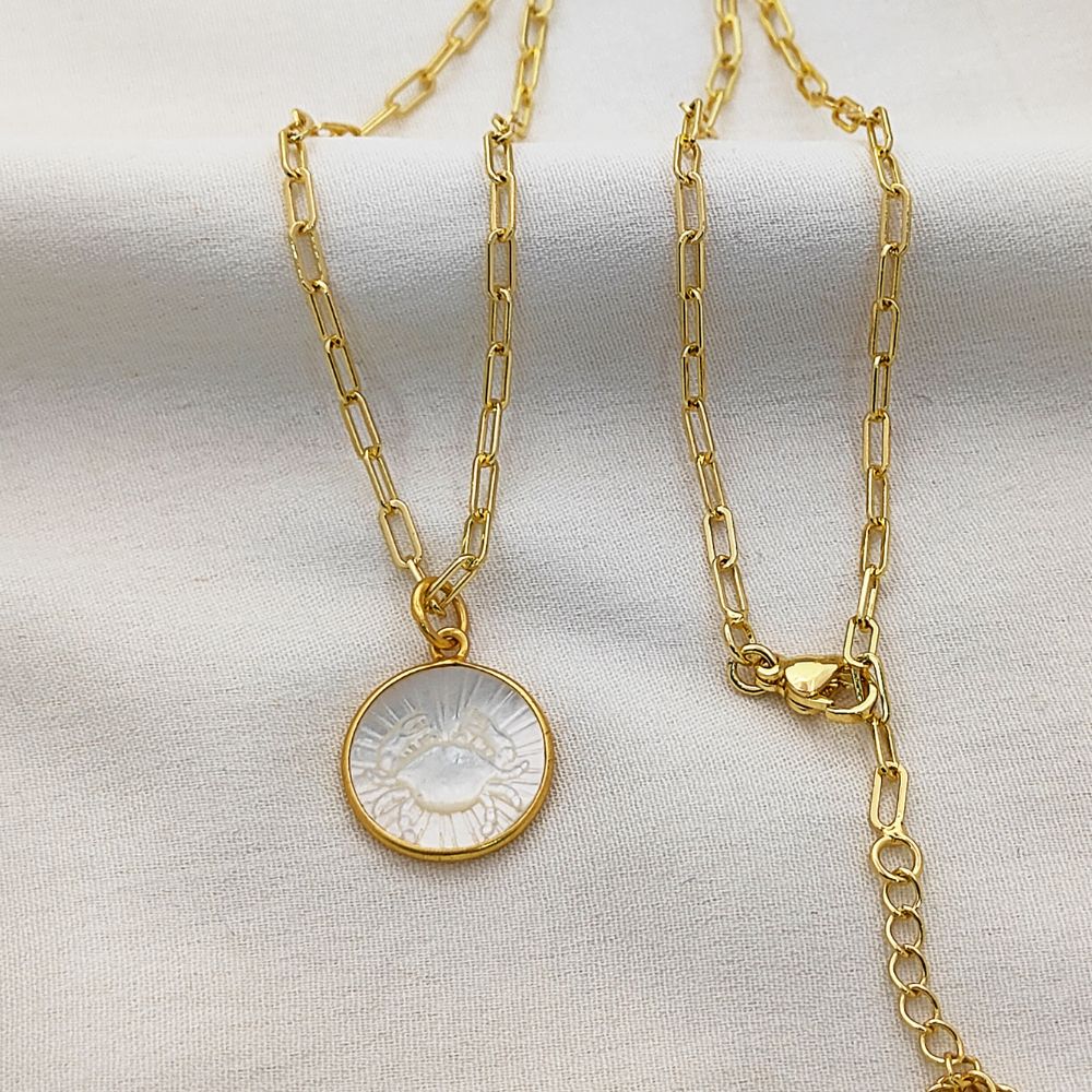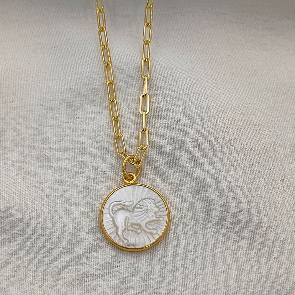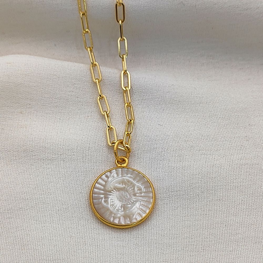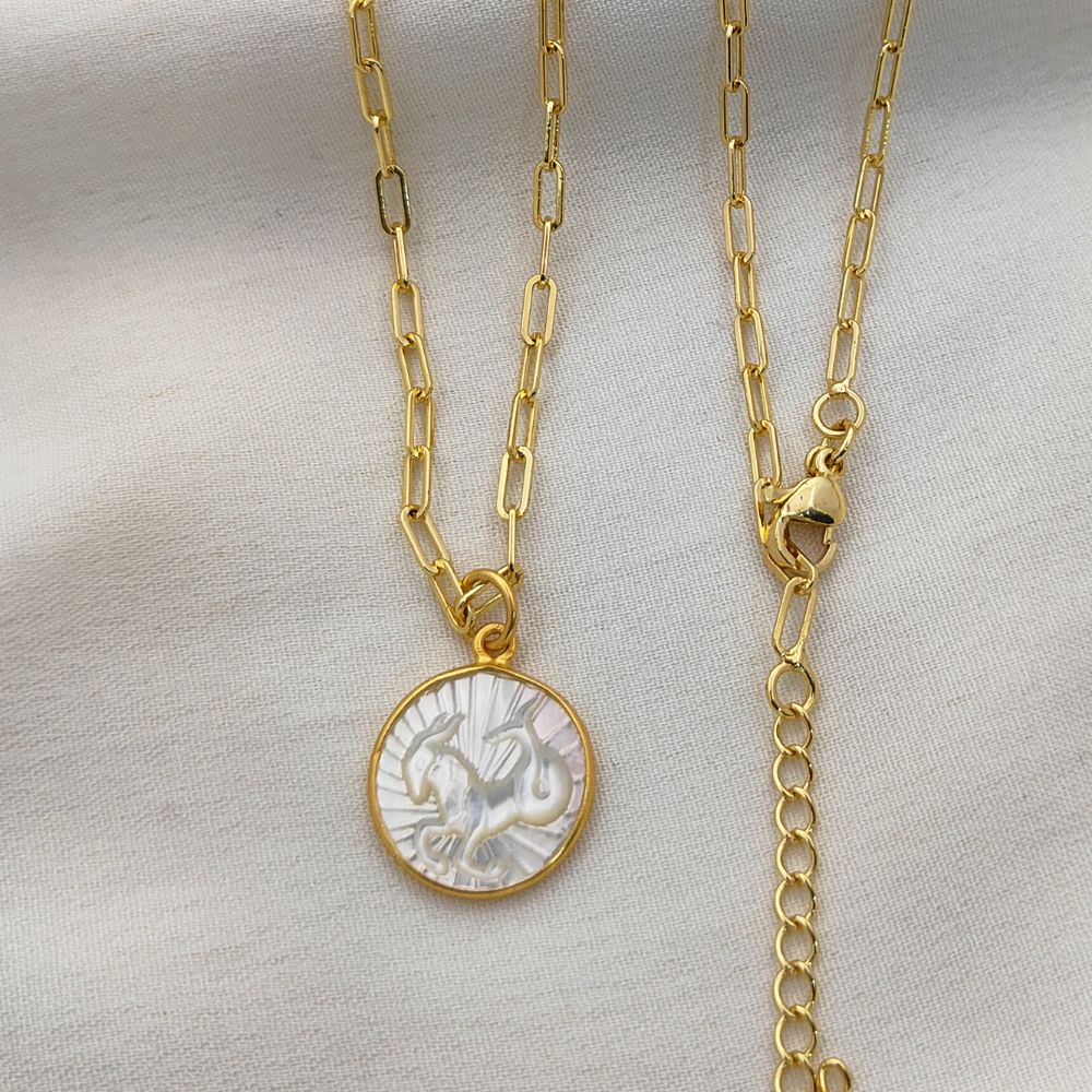 Celebrate your unique celestial identity with this exquisite Mother of Pearl Zodiac Pendant Necklace. Expertly crafted with a radiant mother of pearl inlay, this pendant features your chosen zodiac sign engraved or detailed delicately, creating a harmonious blend of natural elegance and astrological symbolism. The pendant is set in a high-quality gold plated frame, providing a luxurious shine and durability that complements any outfit. Hanging from a trendy gold plated paperclip chain, this necklace is designed for modern, everyday wear, adding a subtle yet meaningful touch to your jewelry collection.