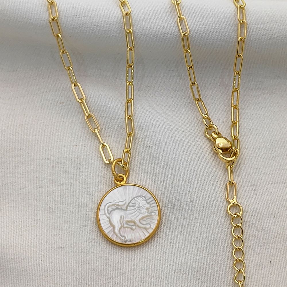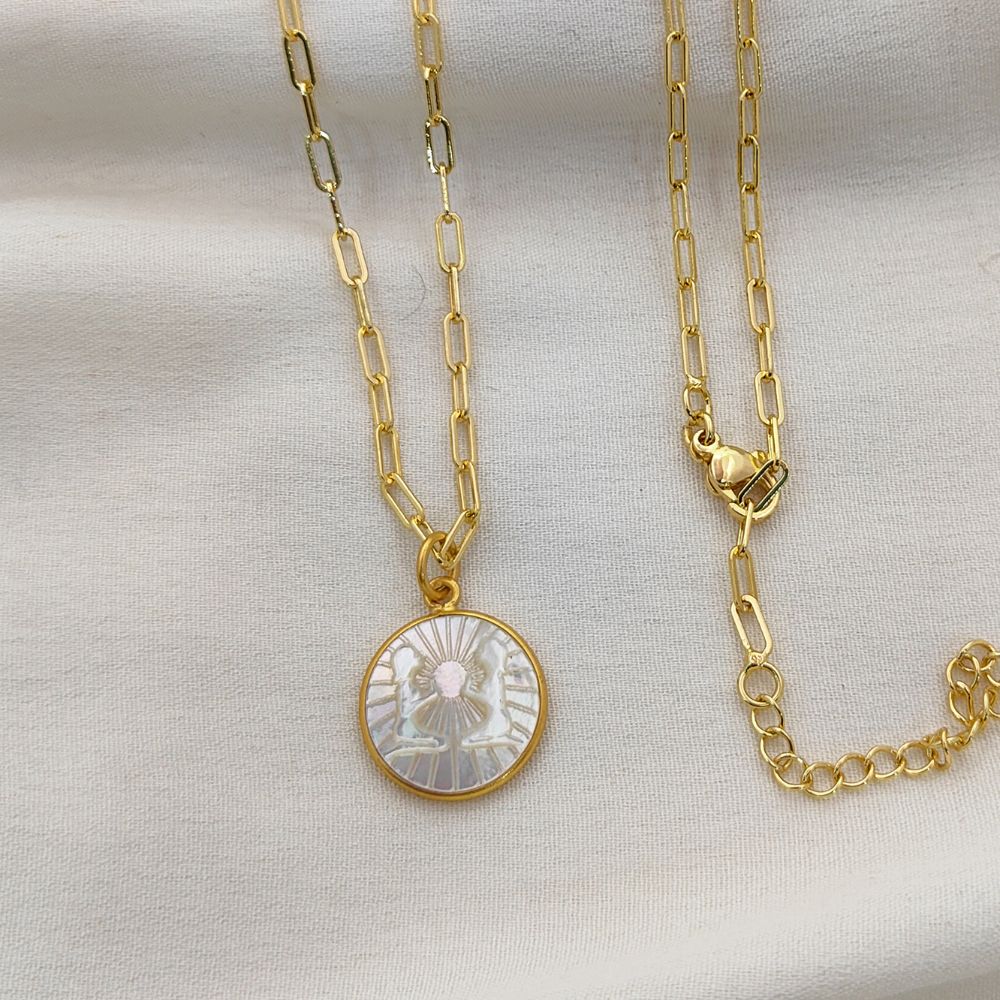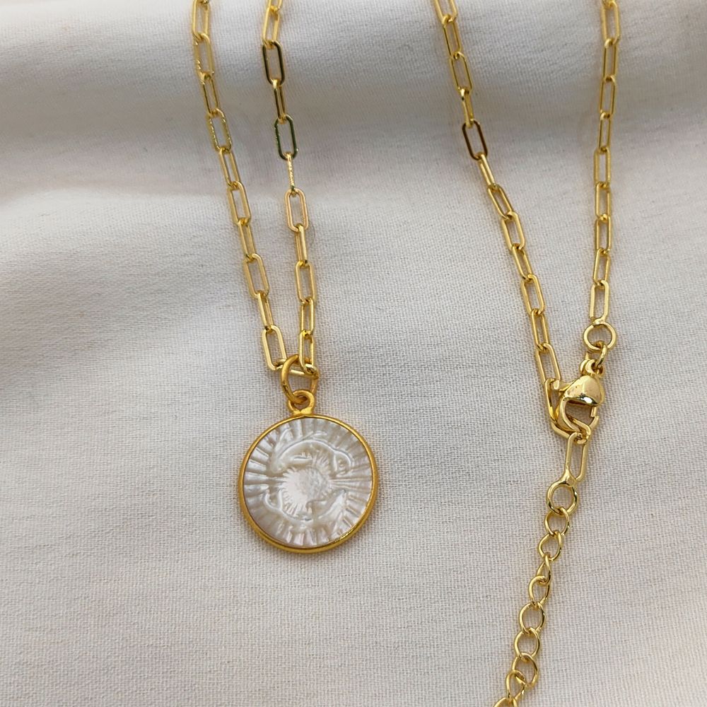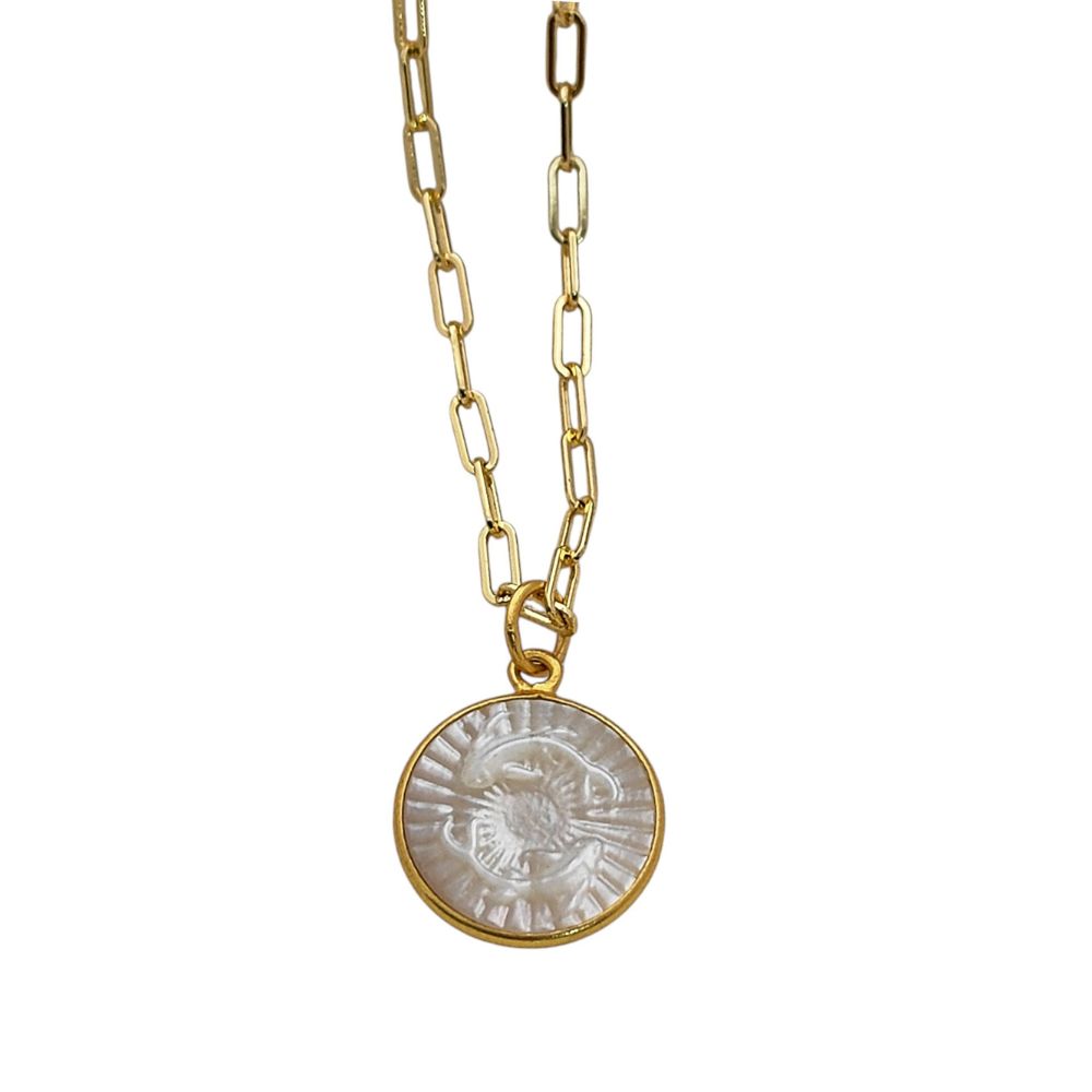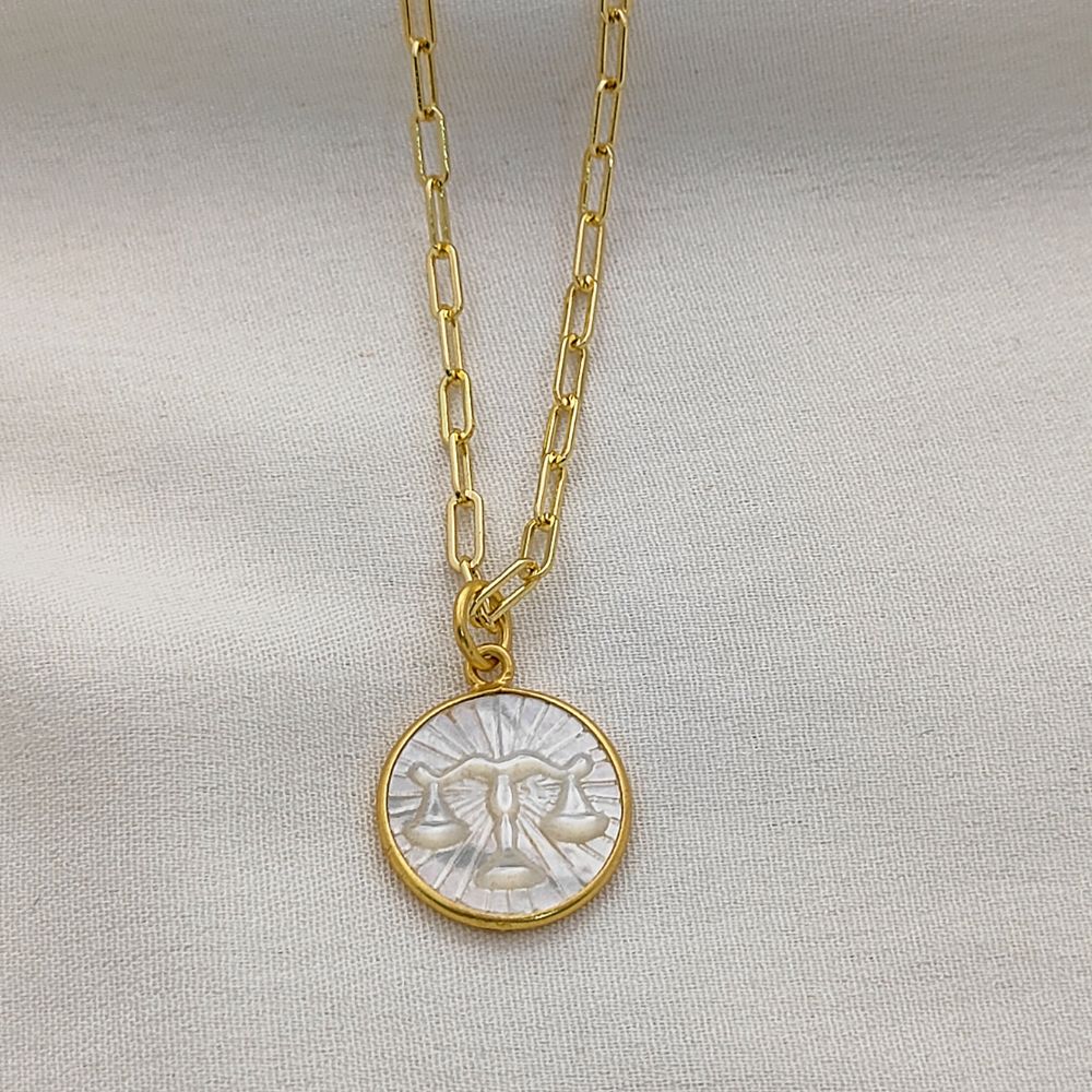 Celebrate your unique celestial identity with this exquisite Mother of Pearl Zodiac Pendant Necklace. Expertly crafted with a radiant mother of pearl inlay, this pendant features your chosen zodiac sign engraved or detailed delicately, creating a harmonious blend of natural elegance and astrological symbolism. The pendant is set in a high-quality gold plated frame, providing a luxurious shine and durability that complements any outfit. Hanging from a trendy gold plated paperclip chain, this necklace is designed for modern, everyday wear, adding a subtle yet meaningful touch to your jewelry collection.