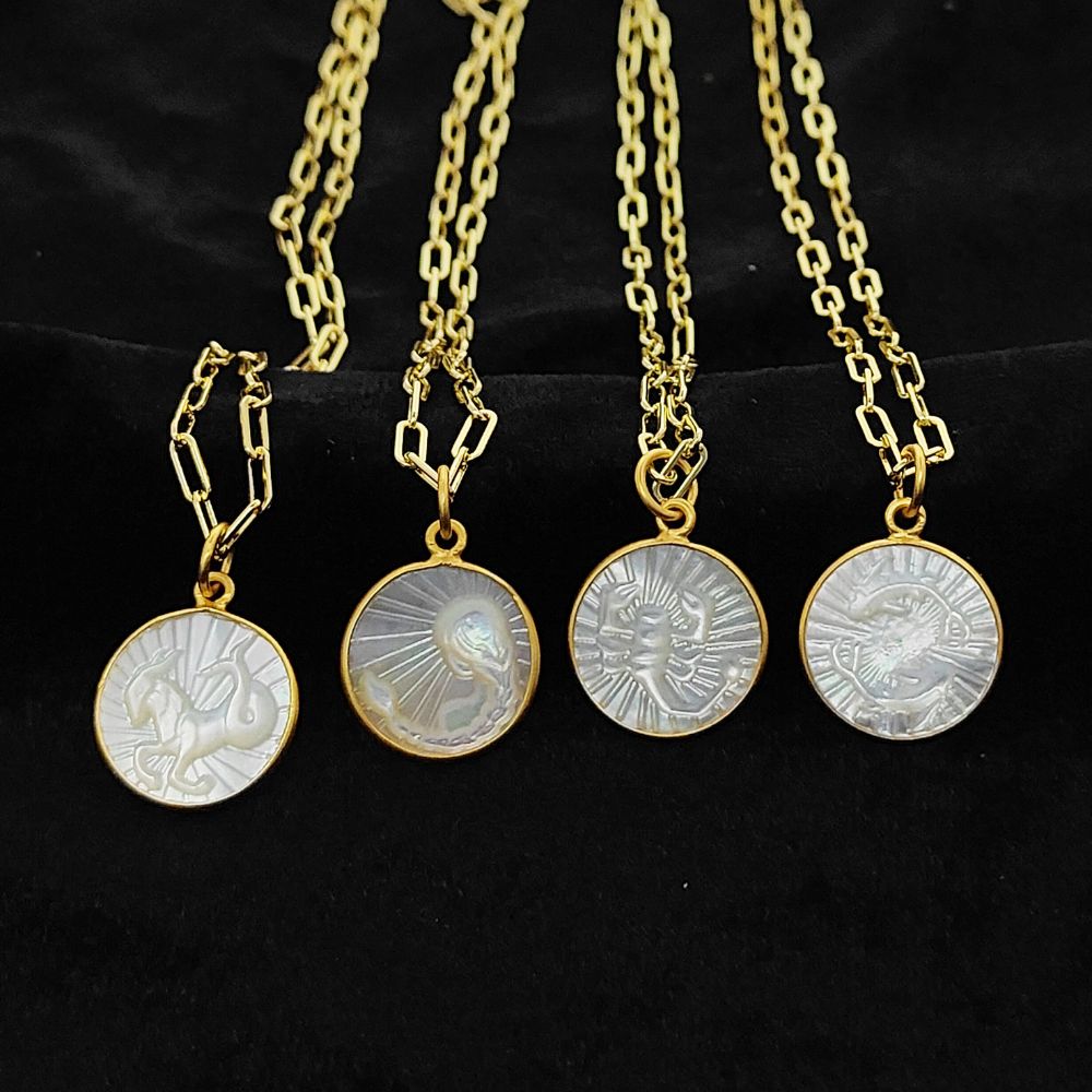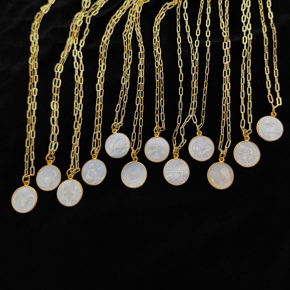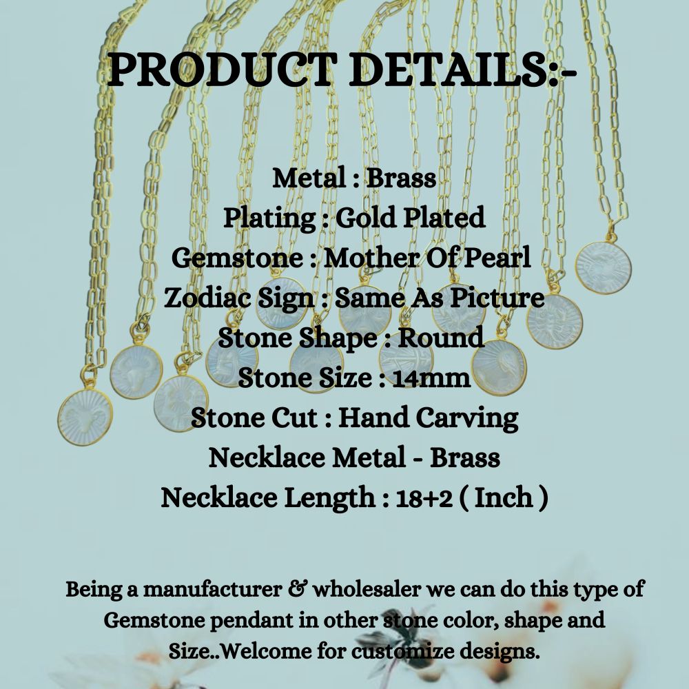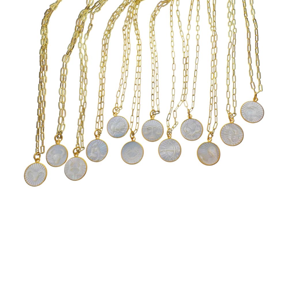 Mother of Pearl Zodiac Pendant for Necklace Gold Plated Astrology Sign Charm on Paperclip Chain Horoscope Jewelry Gift- Selling Per Piece