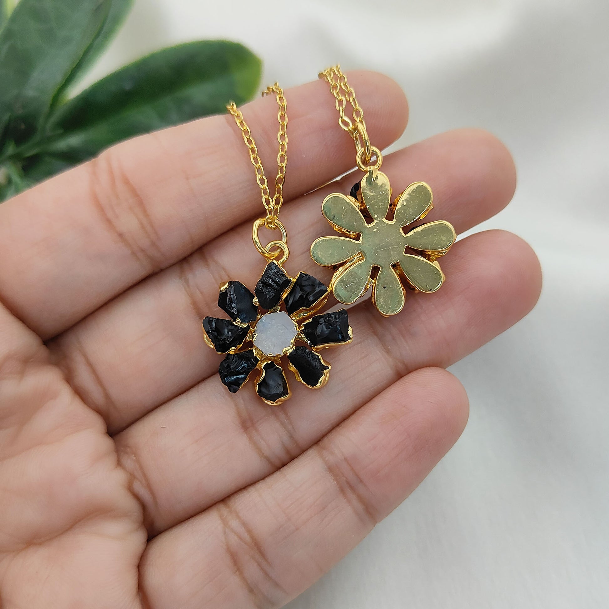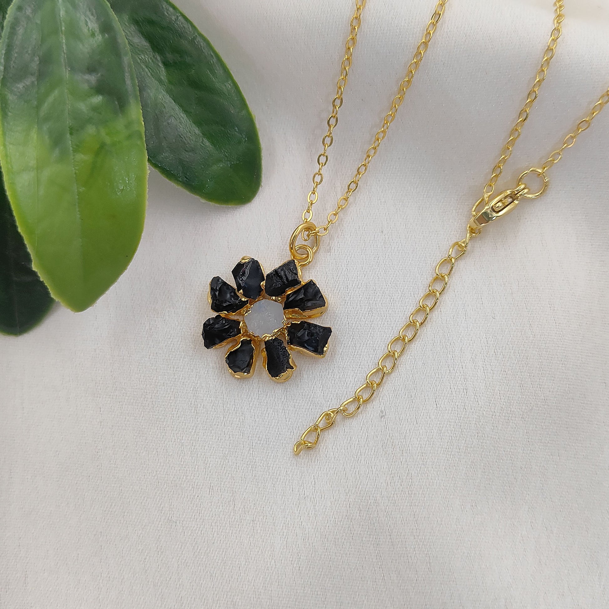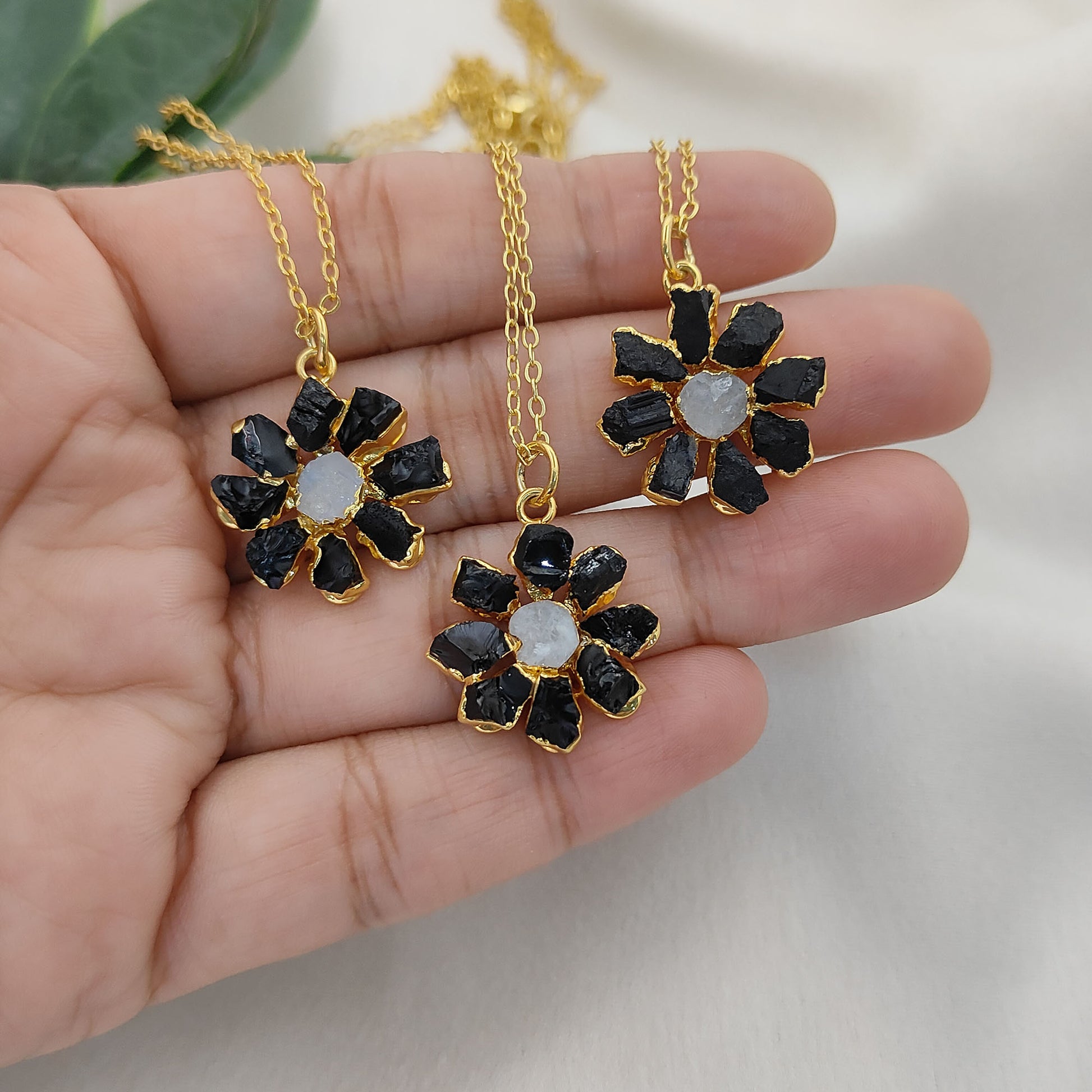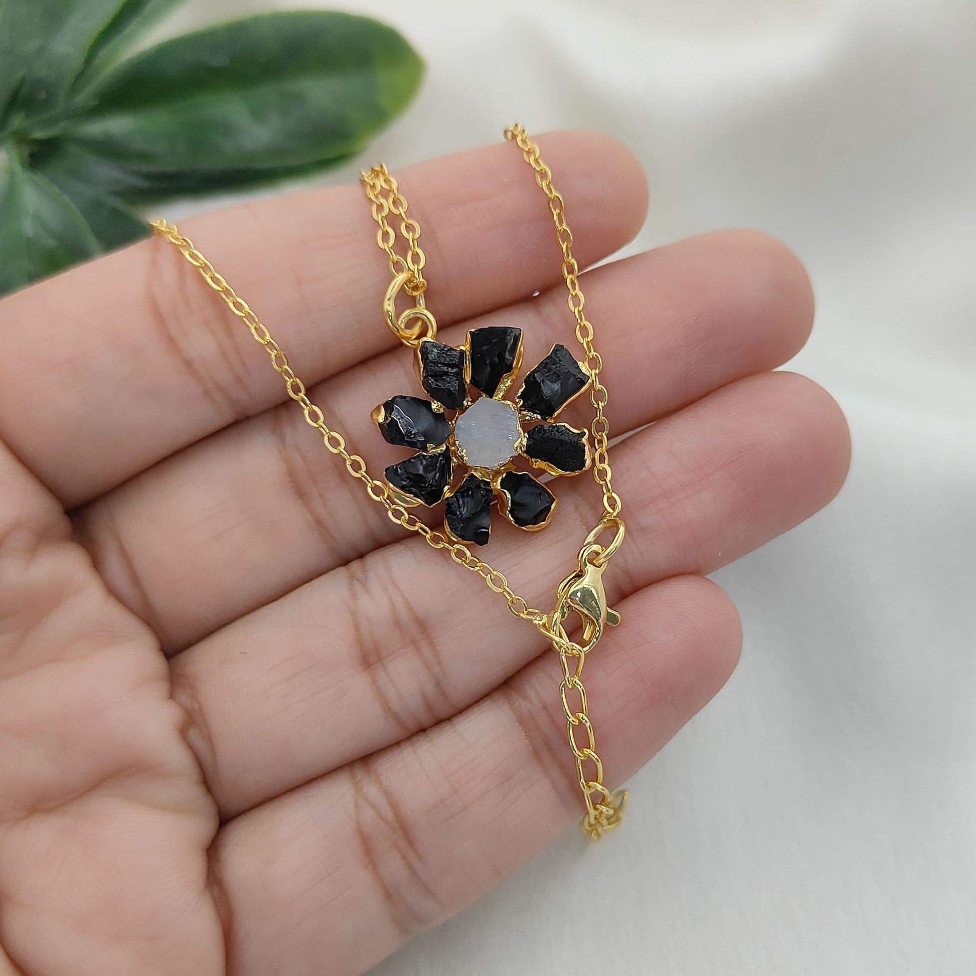 Natural Black Tourmaline Gemstone Necklace Flower Pendant with Rainbow Flash Handmade Jewelry- Selling Per Piece