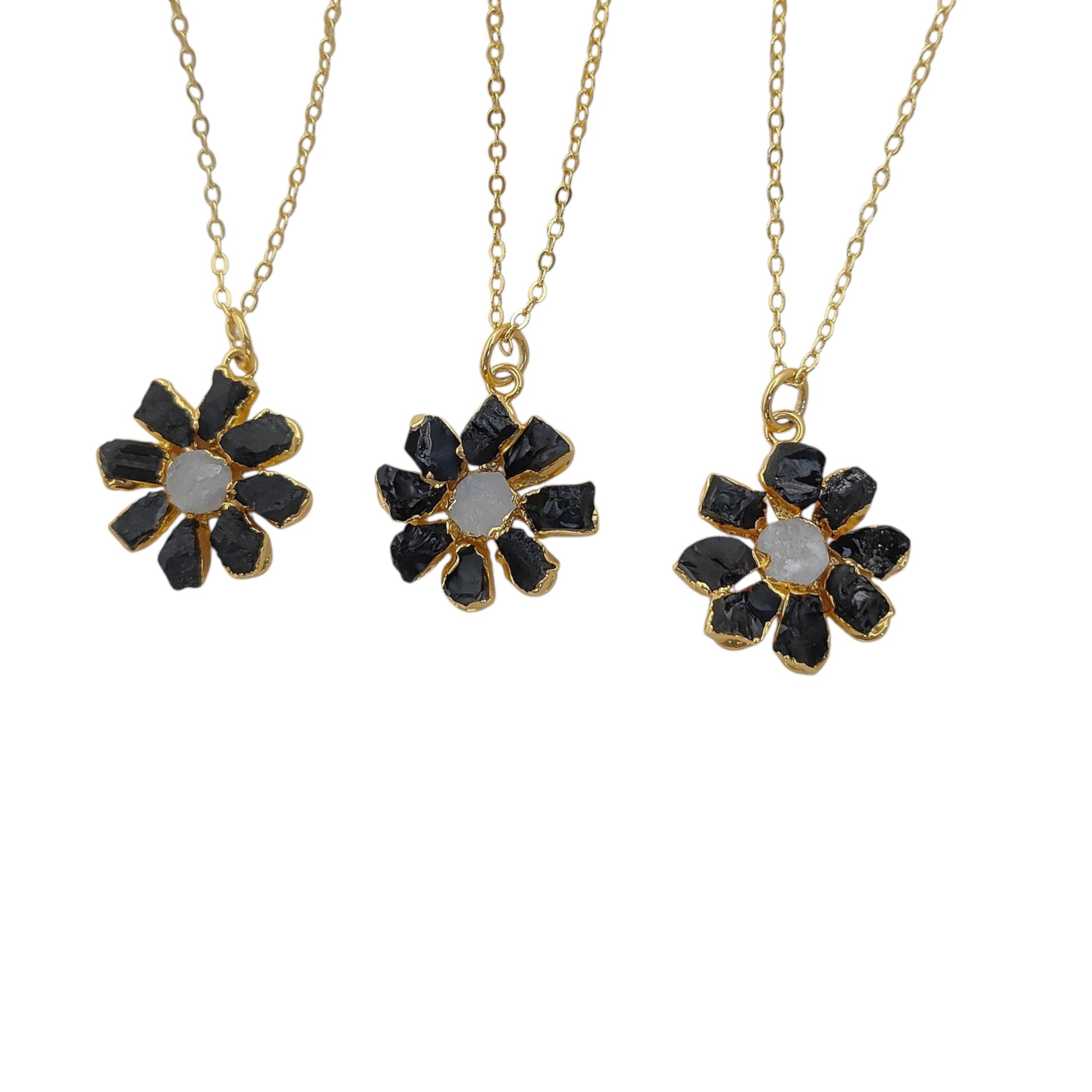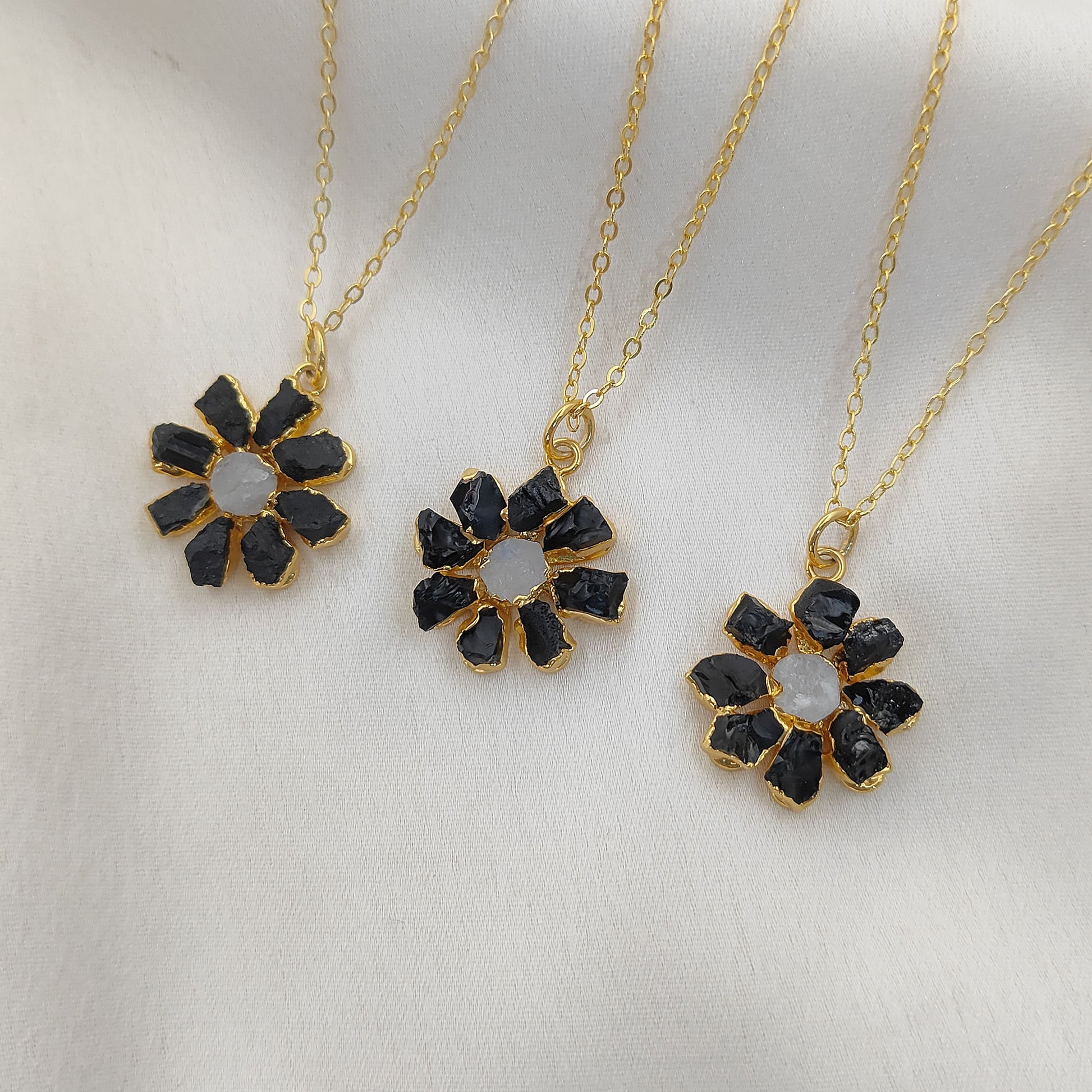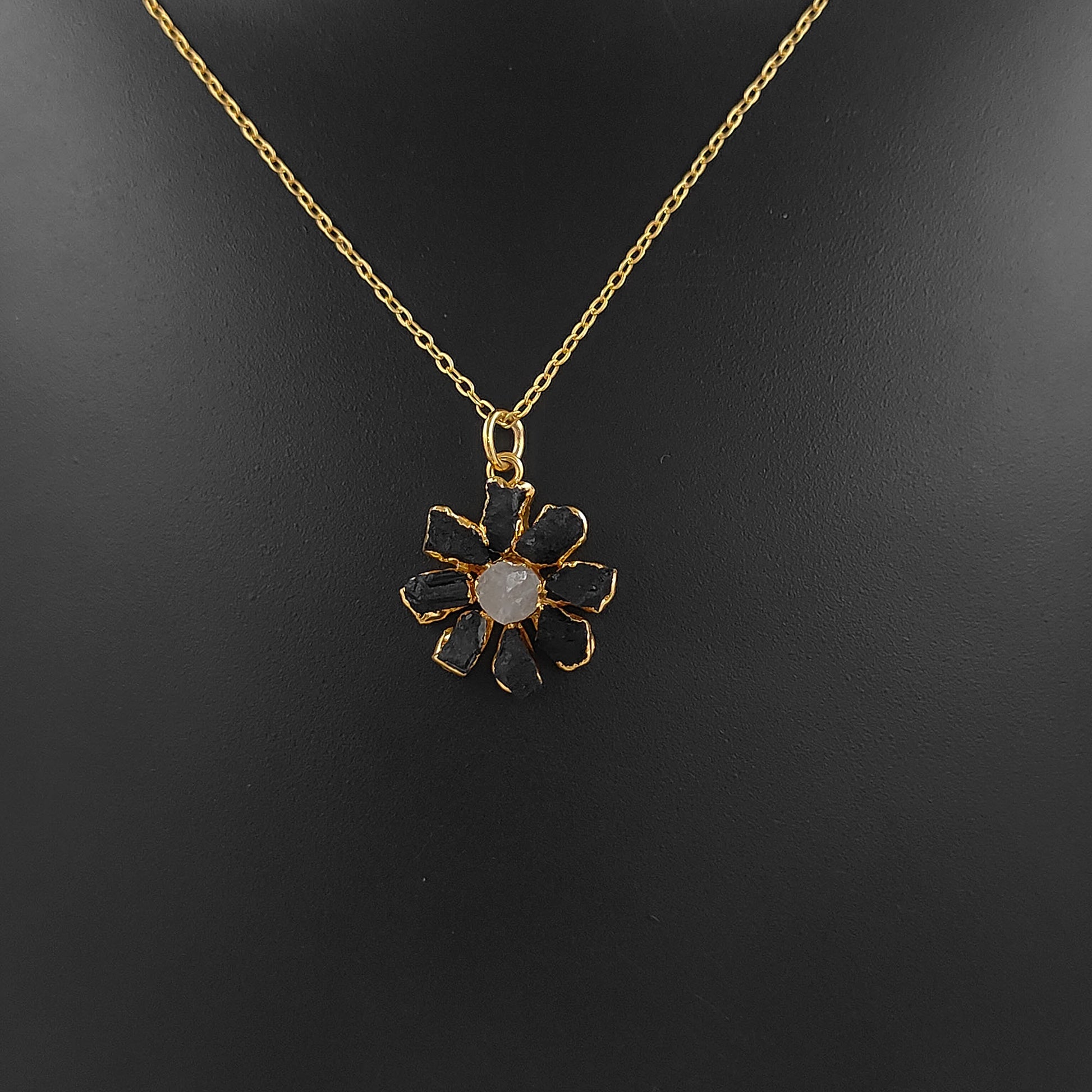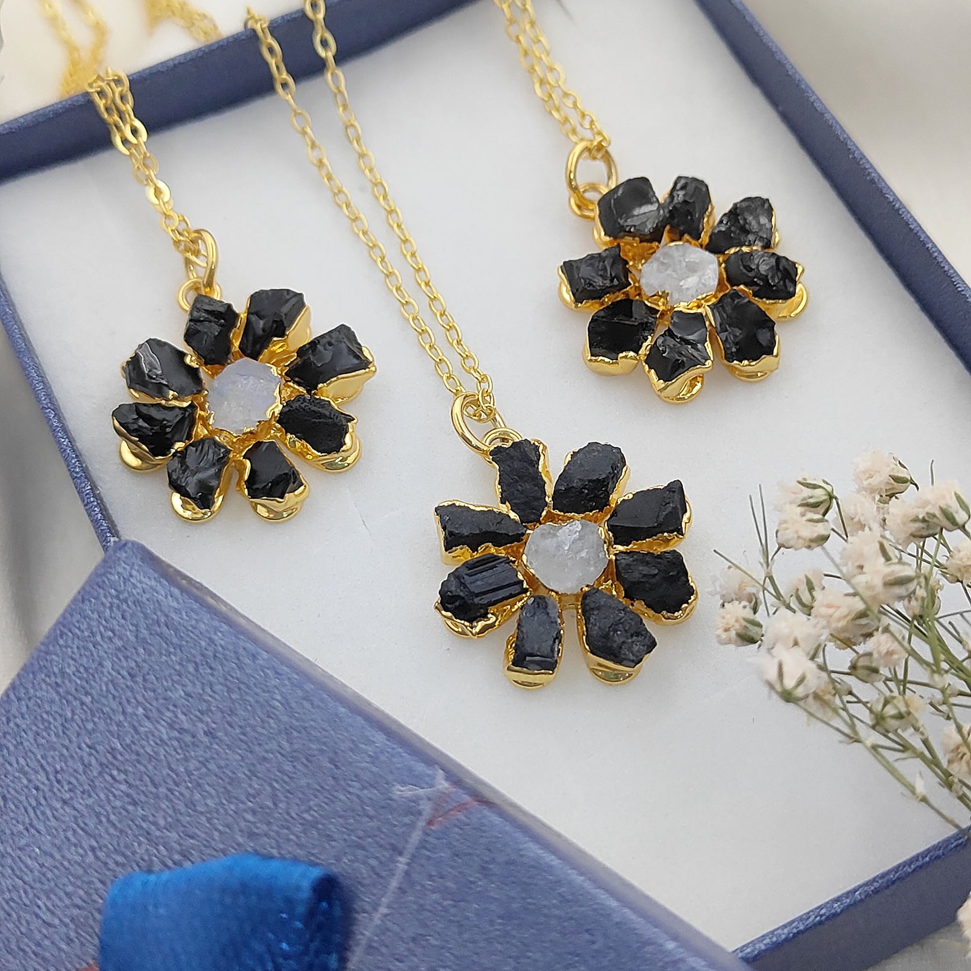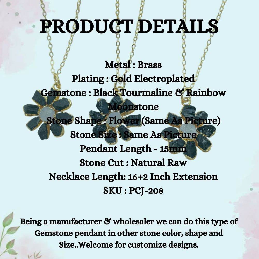 Natural Black Tourmaline Gemstone Necklace Flower Pendant with Rainbow Flash Handmade Jewelry- Selling Per Piece