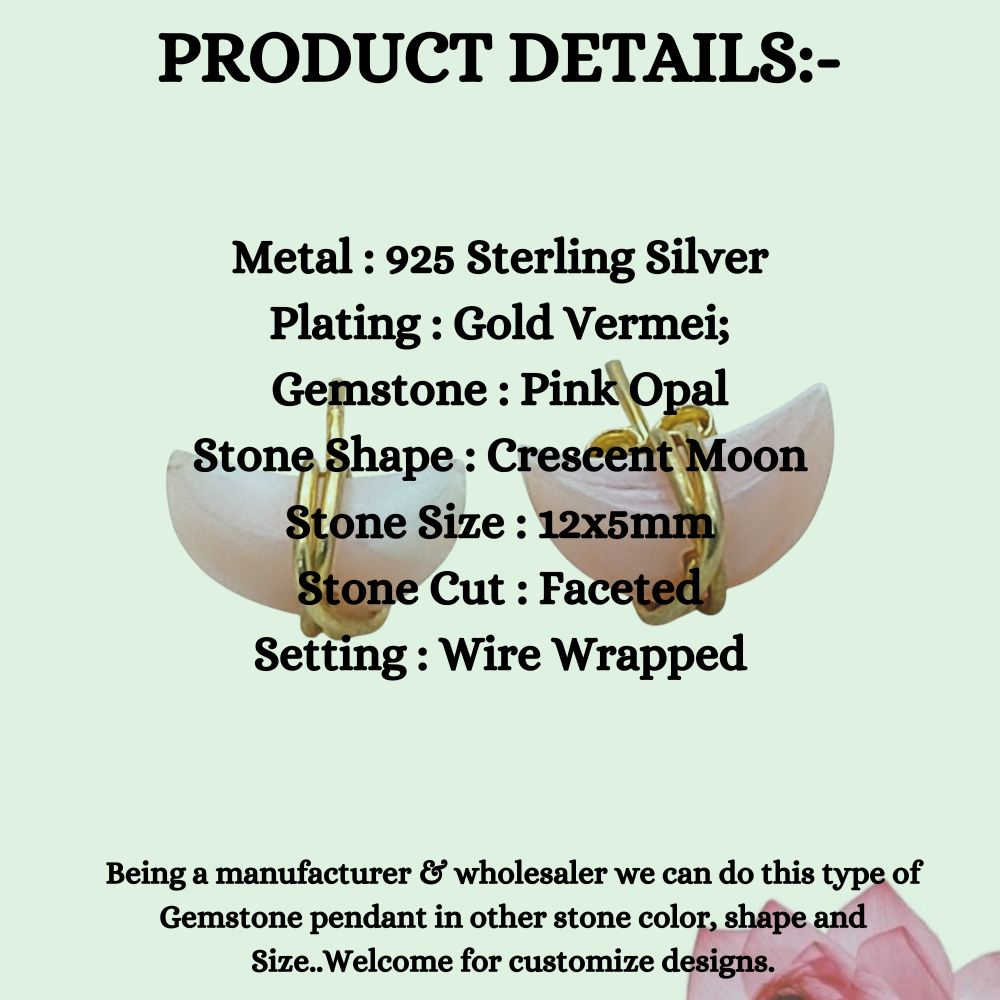 Add a soft, feminine touch to your jewelry collection with these Pink Opal Crescent Stud Earrings. Each earring features a natural Pink Opal gemstone set in a delicate half moon crescent design with handmade gold plated sterling silver, creating a minimalist and elegant accessory that complements any outfit.