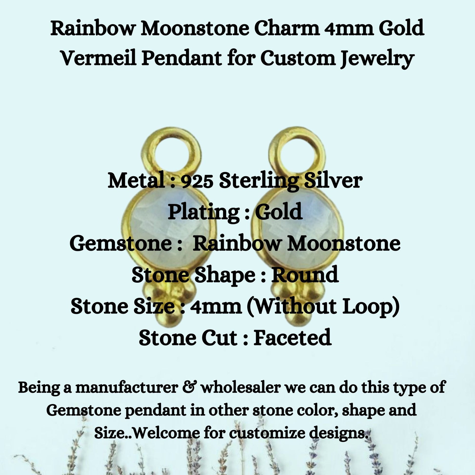 Rainbow Moonstone Charm 4mm Gold Vermeil Pendant for Custom Jewelry