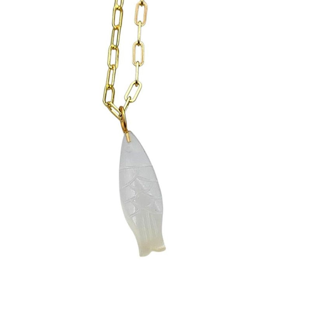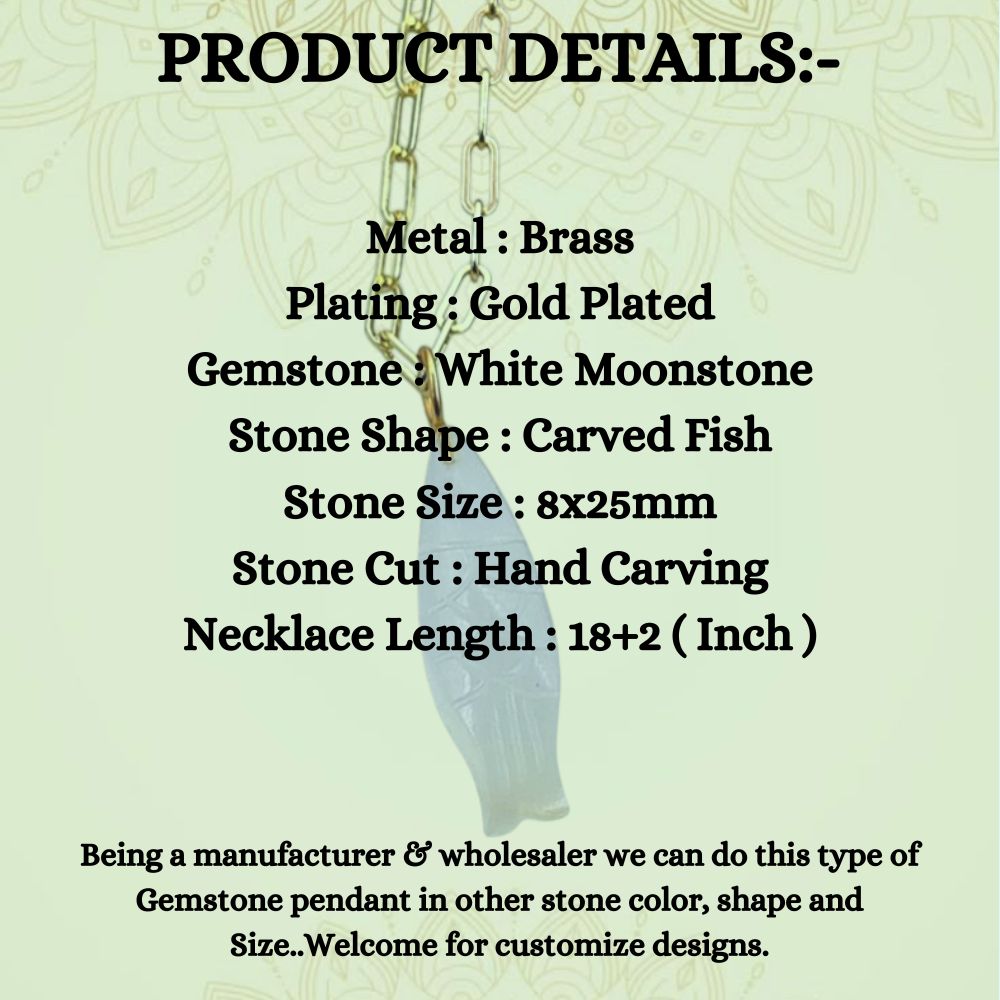 Spiritual White Moonstone Carved Fish Necklace Healing Crystal Pendant in Boho Gold Plate Chain- Selling Per Piece