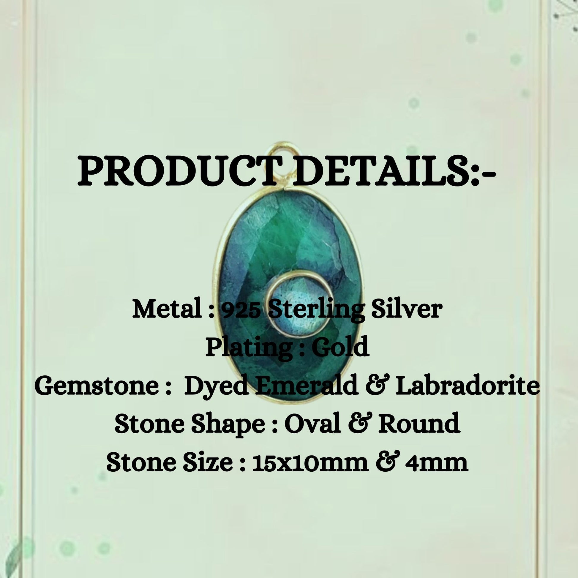 Elevate your accessory collection with our Stunning 15x10mm Oval Dyed Emerald Bezel Set Gemstone Charm featuring a Round Labradorite Double Stone Pendant, crafted in luxurious gold vermeil. This exquisite piece captures the essence of elegance and sophistication, combining the vibrant hues of dyed emerald with the enchanting iridescence of labradorite.
