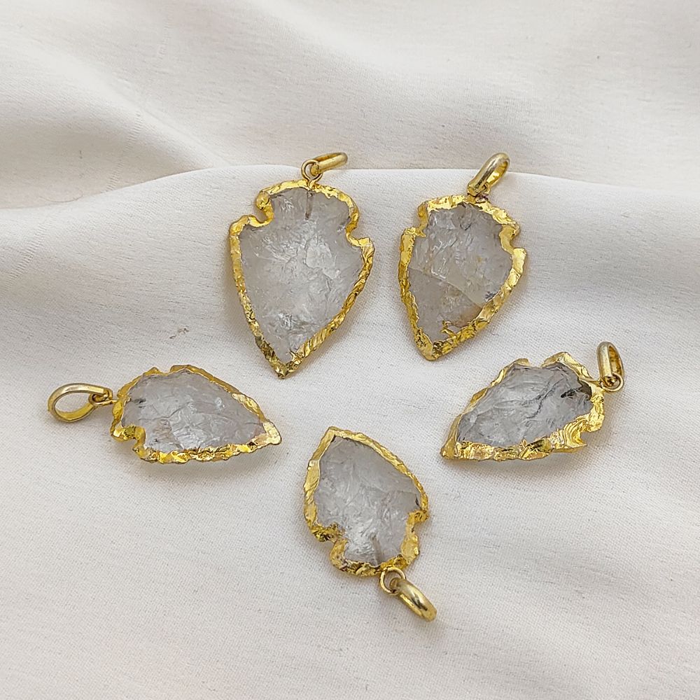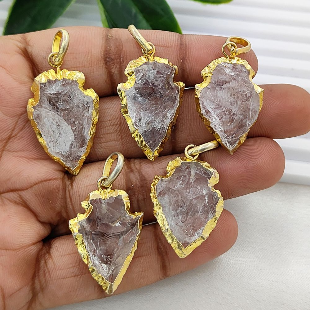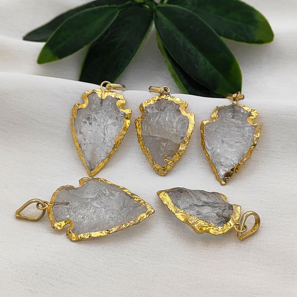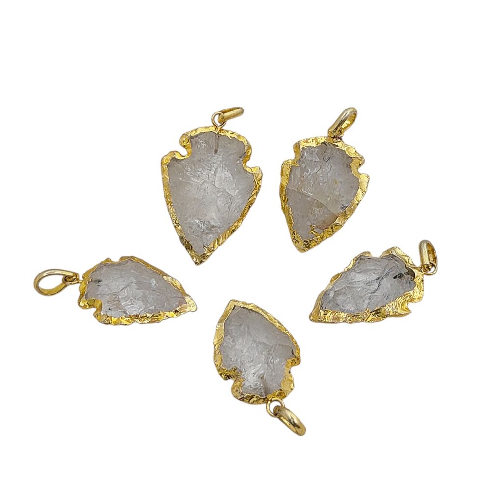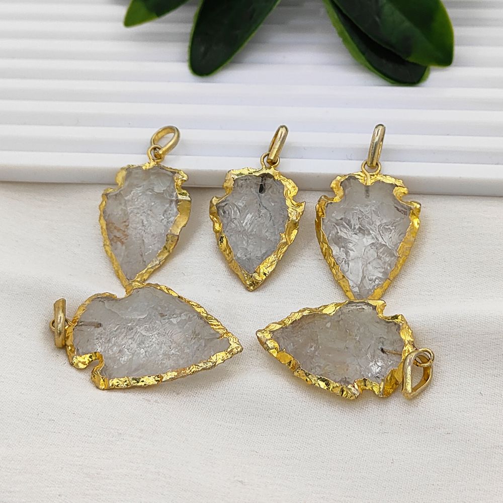 Tribal Style Clear Quartz Arrowhead Pendant Gold Electroplated Gemstone Charm for Boho Jewelry Making- Selling Per Piece