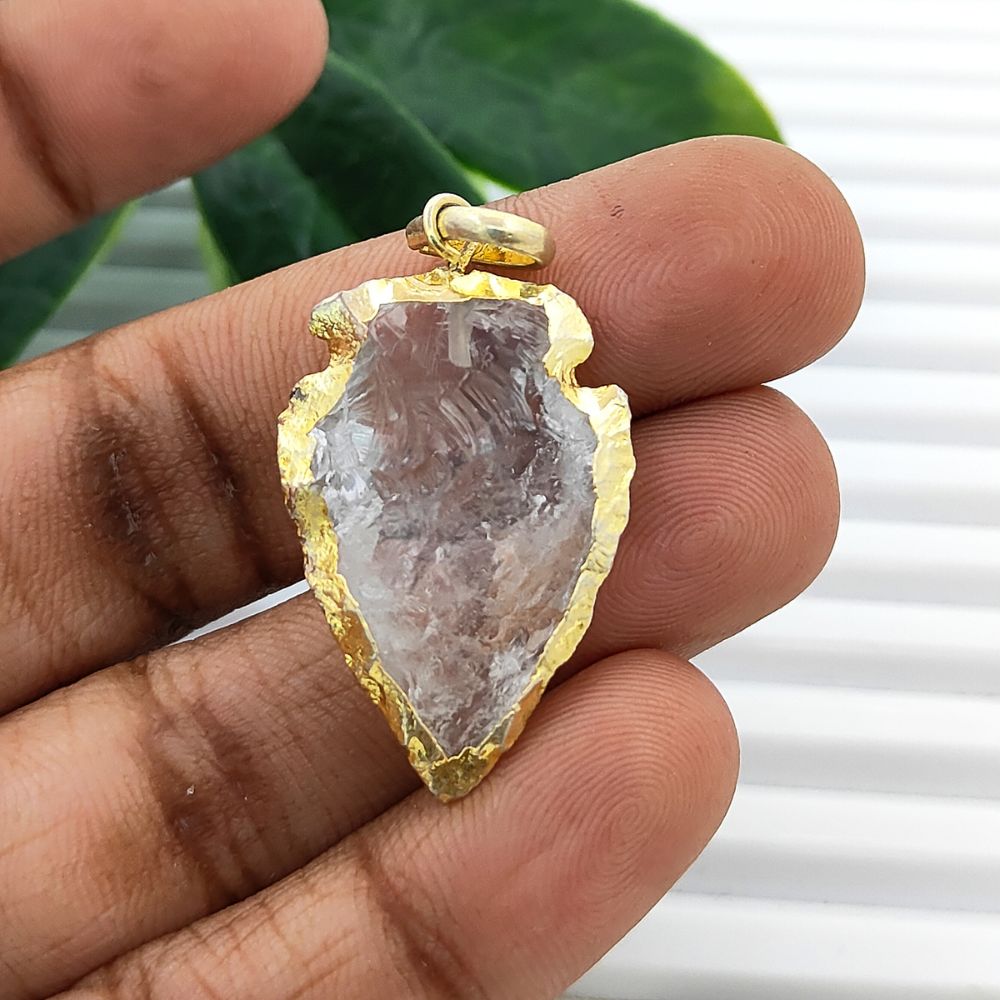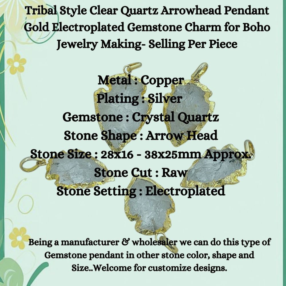 Bring a touch of natural elegance and spiritual energy to your creations with this Tribal Style Clear Quartz Arrowhead Pendant, beautifully finished with gold electroplated edges. Known as the “Master Healer”, Clear Quartz is valued for amplifying energy and promoting clarity, making it a meaningful addition to any jewelry design.