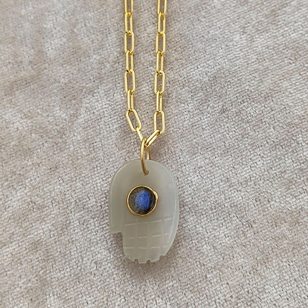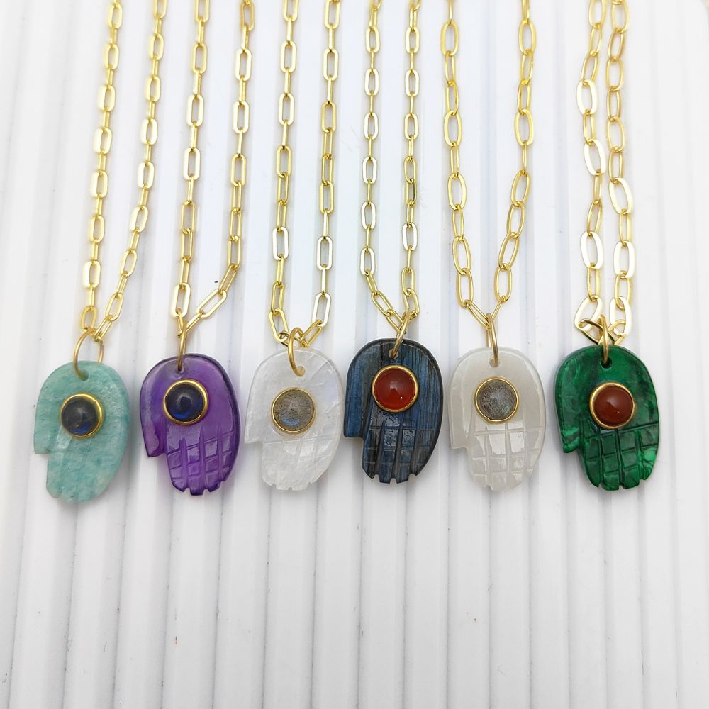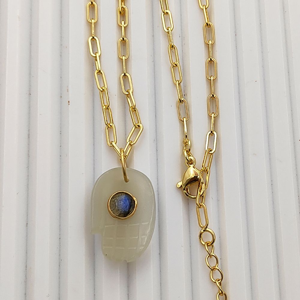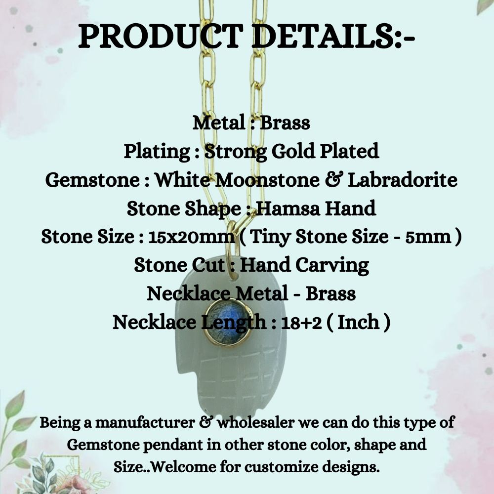 White Moonstone Hamsa Hand Necklace Gold Plated Paperclip Chain Unique Boho Gift for Women- Selling Per Piece