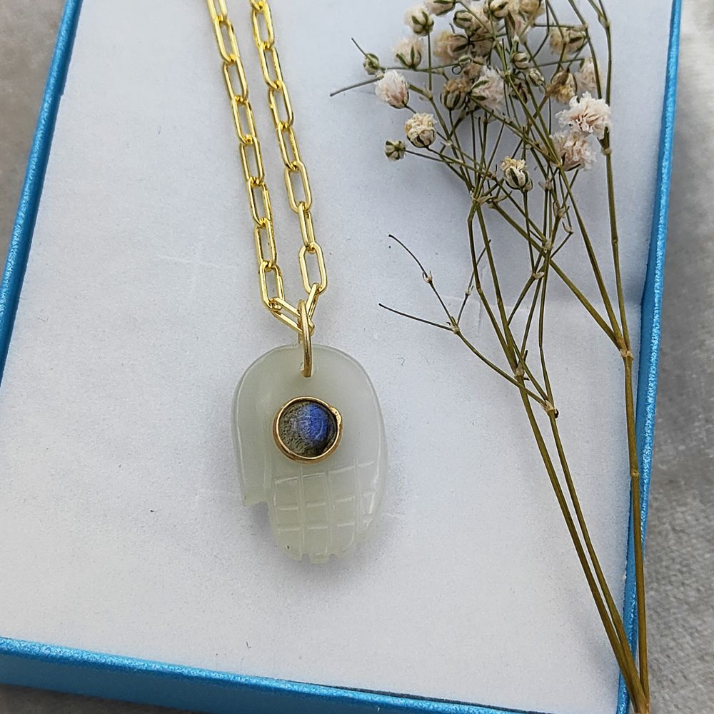 Enhance your style with this handmade Hamsa Hand necklace featuring a genuine White Moonstone pendant. Crafted with a gold plated paperclip chain, this Bohemian spiritual jewelry piece symbolizes protection, positivity, and inner balance. Perfect as a unique and meaningful gift for women on birthdays, anniversaries, or special occasions.